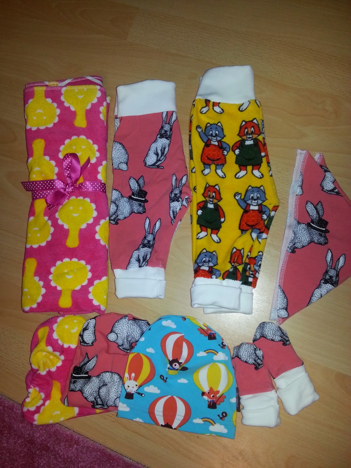 Tässä lisäpläjäys vauvelin housuista. Oikeen housutehdas ollu käynnissä. Nyt kun löytäis jostain kasan yksivärisiä bodeja. :D Kahdet ekat on OB:n puolipotkareista muokkailtu kaava (ilman teräosia, pituutta otettu pois autoissa vyötäröltä & lahkeesta).